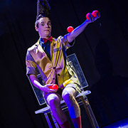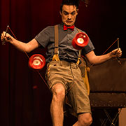 Doch schließlich gelingt es ihm, den Spieß umzudrehen: Er schleudert sein Diabolo wie eine Tanzpartnerin herum und lässt drei Diabolos wie die Tanzgirls in einer großen Revue in großen Schwüngen über die Bühne kreisen. Einfach prachtvoll!