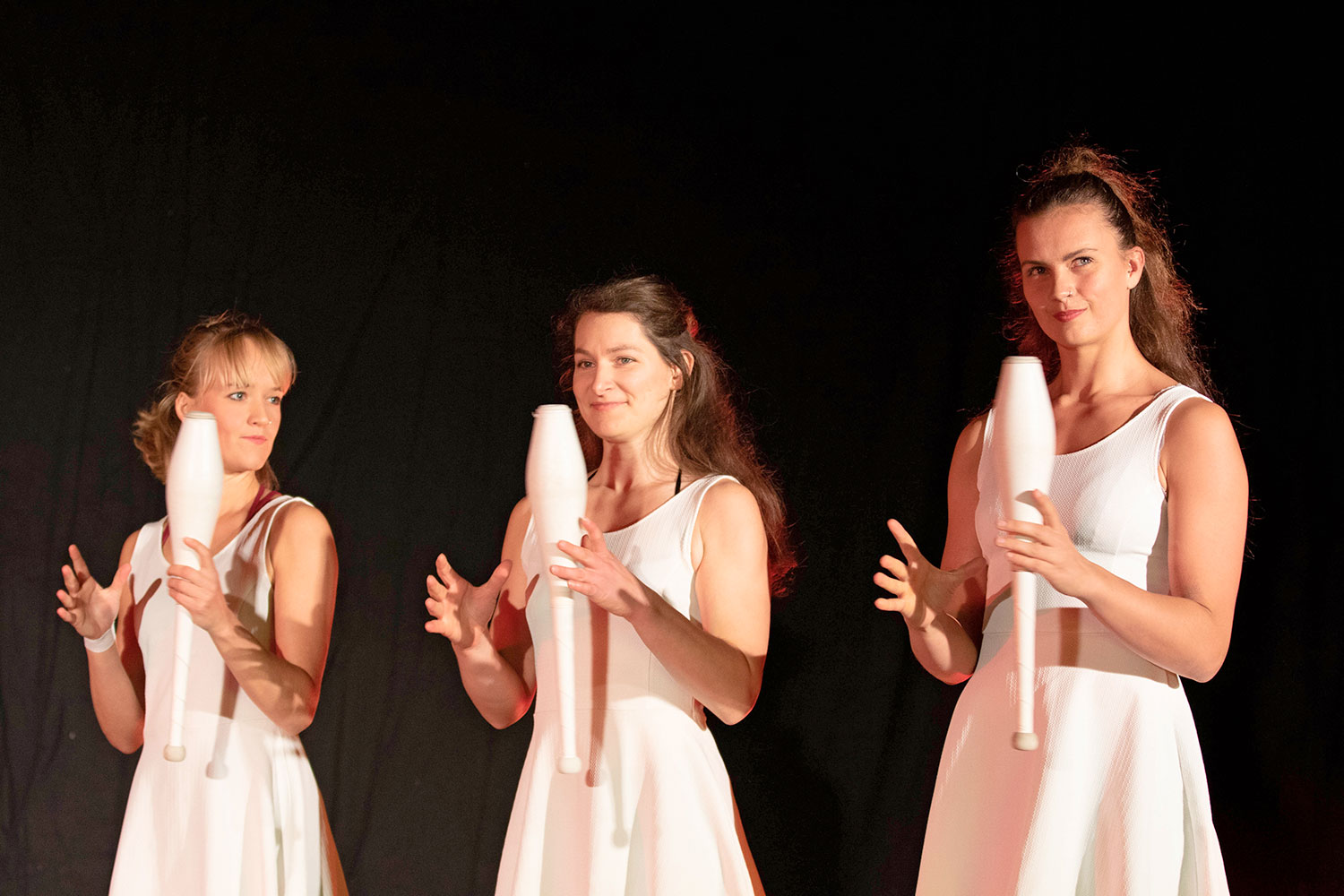 Ronja Siewert ist eine international bekannte Strapaten- und Keulen-Passing-Artistin. Wo sie ist, wird hochgeschaut: Entweder hängt sie selbst mit ihren Strapaten in der Luft oder es werden Keulen geworfen, gefangen und in komplexen Mustern und Bewegungsabläufen vor den Augen des Publikums manipuliert. Charismatisch schafft sie es in verschiedenen Trios sowie mit ihrem eigenen Stil, das Publikum mitzureißen.